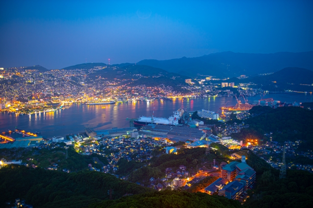 長崎市のランドマークである稲佐山からは、日本三大夜景のひとつに数えられる壮麗な景色を望むことができます。長崎港を取り囲む街の光は、まるで天の川のように湾曲しながら広がり、幻想的な世界をつくり出します。
