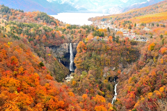 華厳の滝は日本三大名瀑のひとつで、迫力ある水しぶきと紅葉のコントラストが圧倒的です。秋は観光客が増えるため、平日や朝の時間帯を狙うのが賢明。
