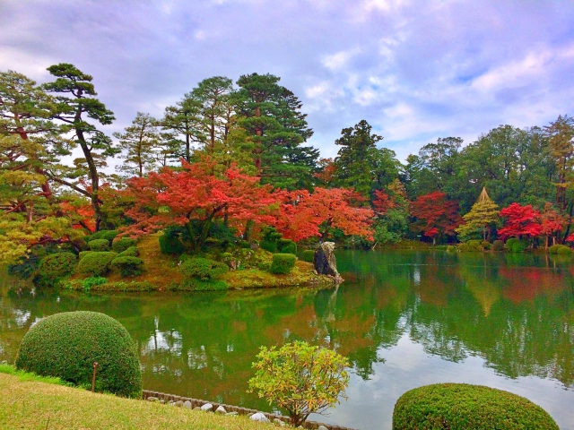 金沢の名園・兼六園は、日本三名園の一つとして知られ、秋には紅葉が池や茶屋町を鮮やかに彩ります。園内には趣ある橋や茶屋が点在し、和の情緒が漂う落ち着いた雰囲気が魅力。